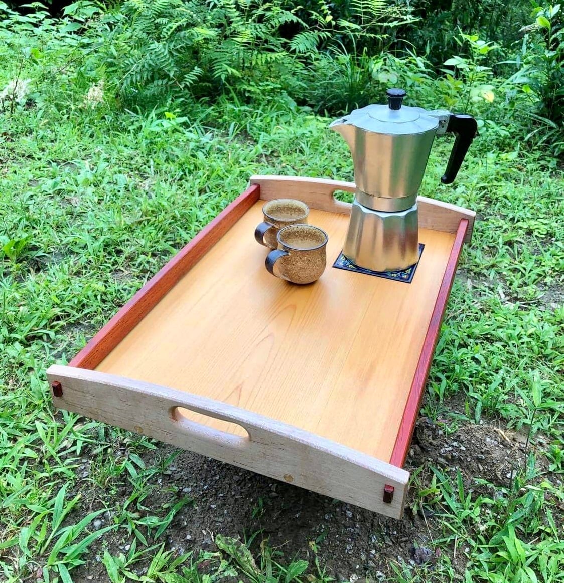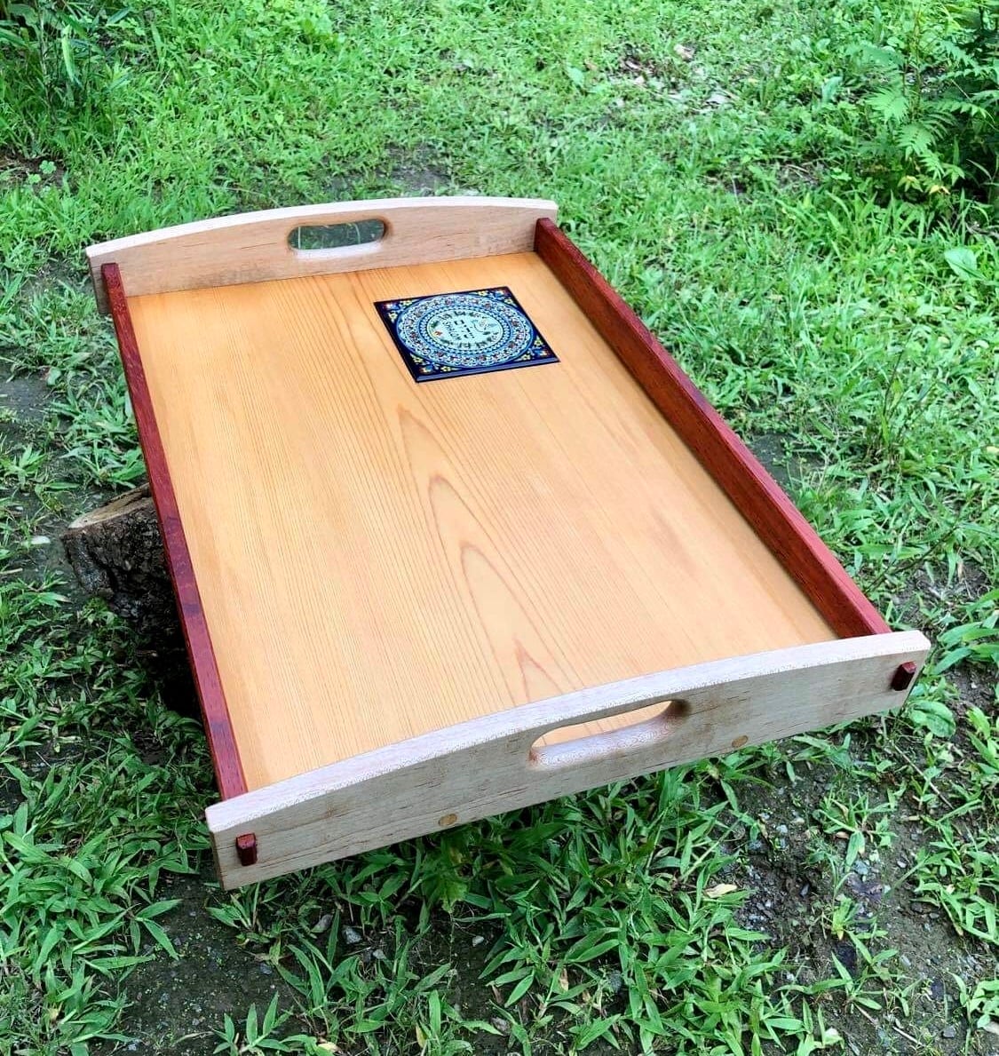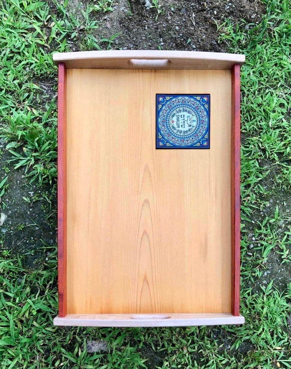 サワラ材のおぼんに鮮やかなエルサレムのタイルを埋め込みました。