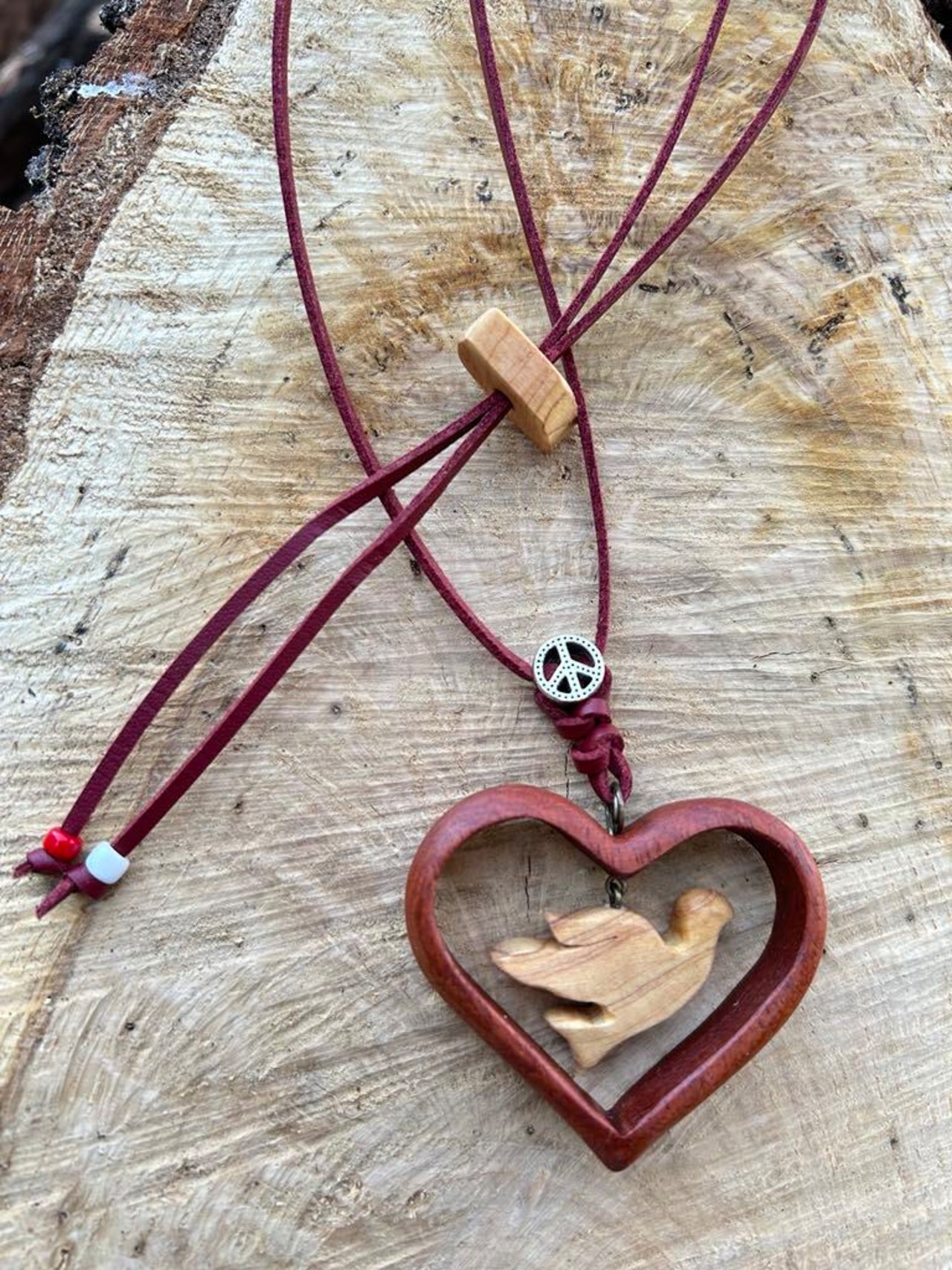 ハート:カリン材 鳩:ヒノキ材 ひも:合皮
